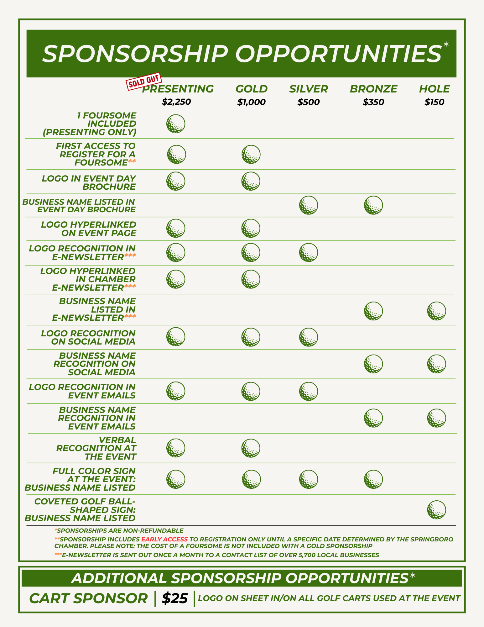 Gold $1,000: First ACCESS to foursome in the outing (limit 1 foursome, first access until 4/6/26), Recognition in e-newsletter, in event emails, and on social media, verbal recognition at the event, logo hyperlinked on event page and in Chamber e-newsletter (e-newsletter sent out to 5,500+ contacts on a monthly basis), full-color sign at the event, and full-color logo included in event day brochure